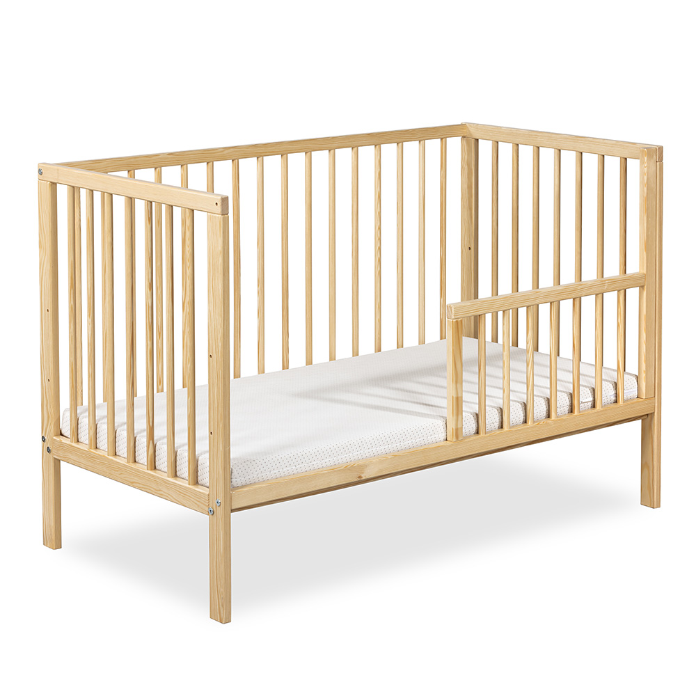 Łóżeczko zachwyca swoją prostotą i eleganckim designem, a okrągłe szczebelki dodają mu delikatności i harmonii. Posiada trzy wyjmowane szczeble, co ułatwia wkładanie i wyjmowanie maluszka, a także umożliwia dostosowanie wysokości materaca na trzech poziomach – tak, aby jak najlepiej dopasować je do potrzeb rosnącego dziecka.